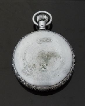 Waltham open faced keyless winding military pocket watch with inset subsidiary seconds dial, luminous hands and Arabic numerals, black face, stainless steel case marked to the back with ministry broad arrow and 6049 and signed 16S movement, case diameter 51mm, serial number 31692159.