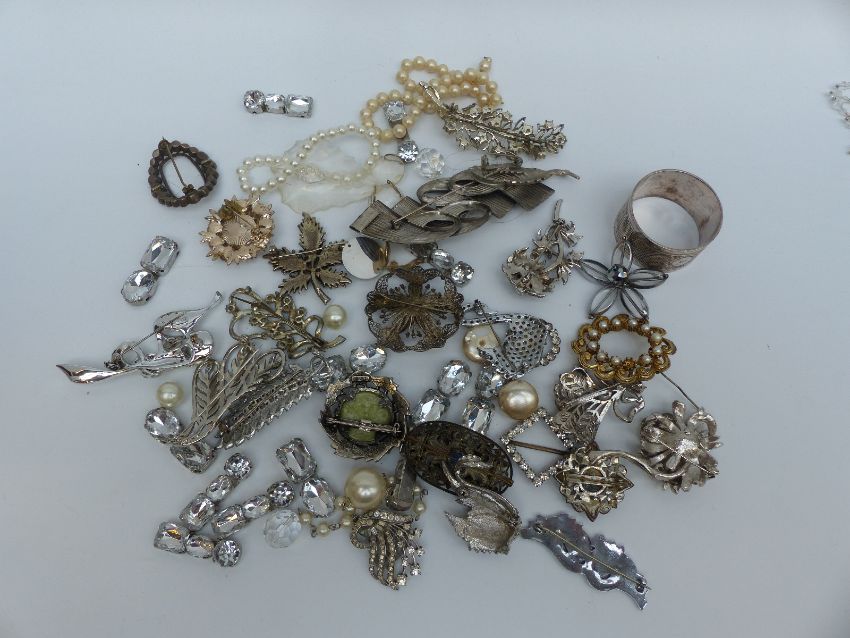 A collection of costume jewellery including filigree brooch, brooches, marcasite, faux pearls, Victorian paste brooch etc