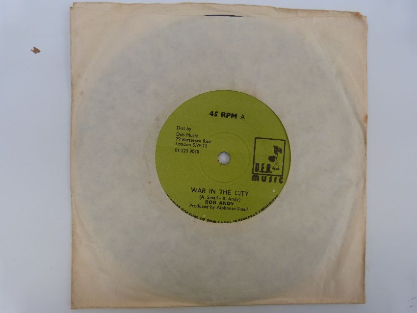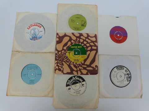 Seven collectable reggae singles, all appear at least VG. Reggae With You - Altan Ellis (TW49), Little Nut Tree - The Melodians (DB1125), What's Your Name - Dennis Lowe (DT465), War In The City - Bob Andy, Bombshell - Crystalites (EX2005), Love You The Most - Lloyd Clarke (BW1405), Wrestling - The Message (REG3004) sticker on label