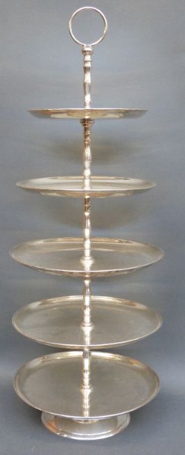 A silver plated five tier cake stand with loop handle, 63cm tall