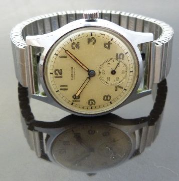 Elegance gentleman's wristwatch with inset subsidiary seconds dial, luminous hands, Arabic numerals, champagne face, stainless steel case and 15 jewel movement, on expanding metal bracelet, case diameter 34mm, serial number 632.