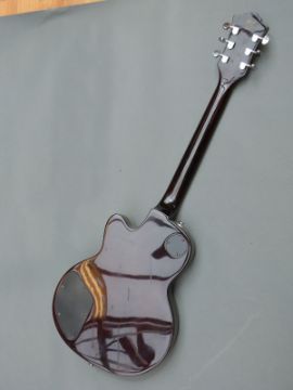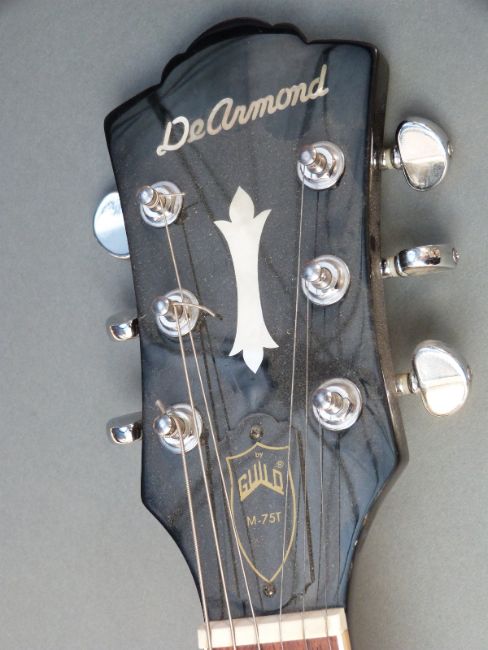 DeArmond M-75T c1970 Les Paul style solid mahogany electric Bigsby Tremelo guitar, mother of pearl block inlays to finger board and antique sunburst finish to table, serial no. s / n 8100721, with hard case