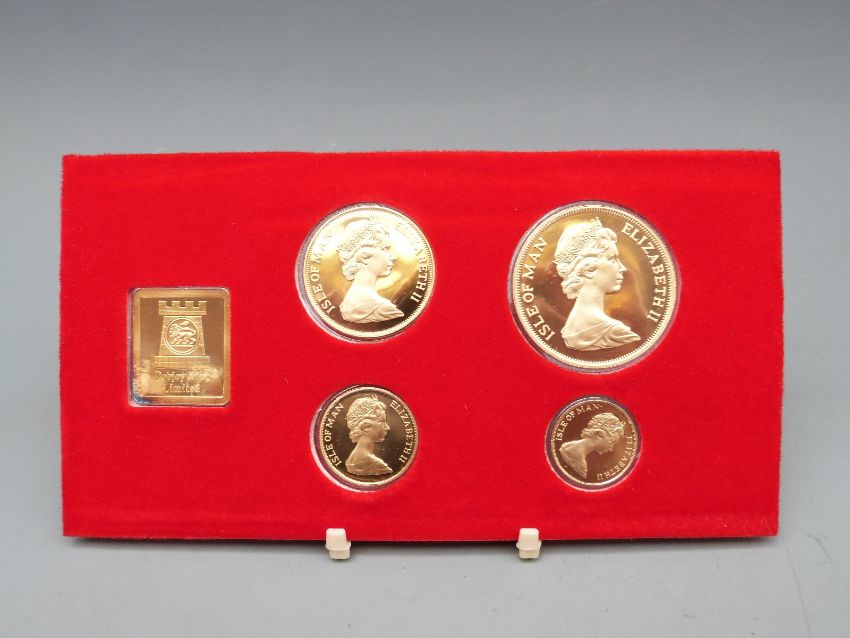 Pobjoy Mint 1979 22ct gold proof set with additional ingot, £5 and £2 pieces, full gold sovereign and half sovereign in original case, uncirculated in original plastic film