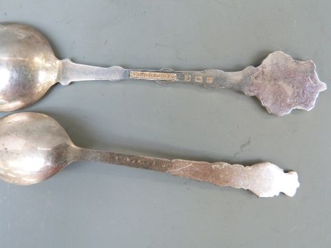 Five hallmarked silver and white metal collectors' spoons 49g all in, two further spoons and two hallmarked silver mounted dressing table items
