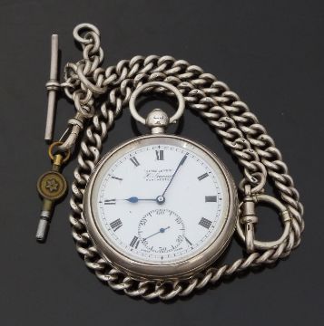 H Samuel hallmarked silver open faced pocket watch with inset subsidiary seconds dial, blued hands, Roman numerals, white enamel face, engraved case and signed movement, on hallmarked silver Albert chain, case diameter 52mm, serial number 690920, in original fitted box.
