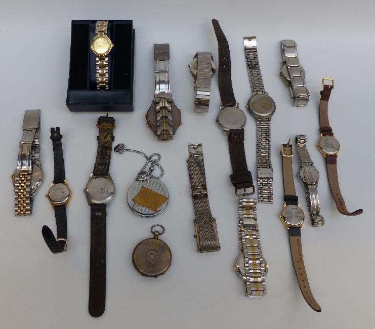 Fourteen various ladies and gentleman's wristwatches including Avia, Rone, Timex etc together with a white metal pocket watch and one other.