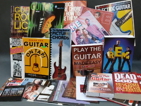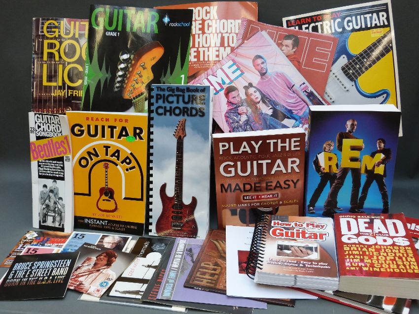 A collection of guitar related and 'How to Play Guitar' books together with 'Dead Gods, The 27 Club' by Chris Salewicz, 7" singles etc