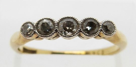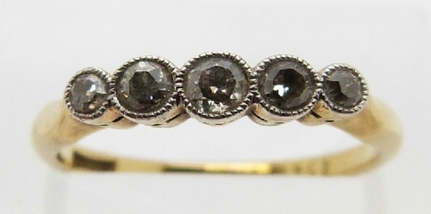 An 18ct gold ring set with five diamonds, size L, 2.4g