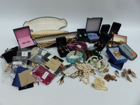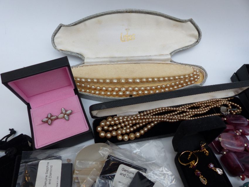 A collection of jewellery to include rubies, garnets, sapphires, emerald jewellery in gilt necklaces and earrings, Lotus pearls, costume jewellery etc