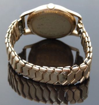 Rolex Precision 9ct gold gentleman's wristwatch with white face, gold hands and chevron markers, Dennison case and signed 17 jewel movement, on expanding gold plated bracelet, case diameter 35mm, serial number 16543, in original box with outer box and service paperwork.