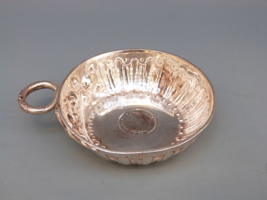 George V hallmarked silver coin inset tastevin, London 1912 maker D & J Welby Ltd, length 12cm, 123g