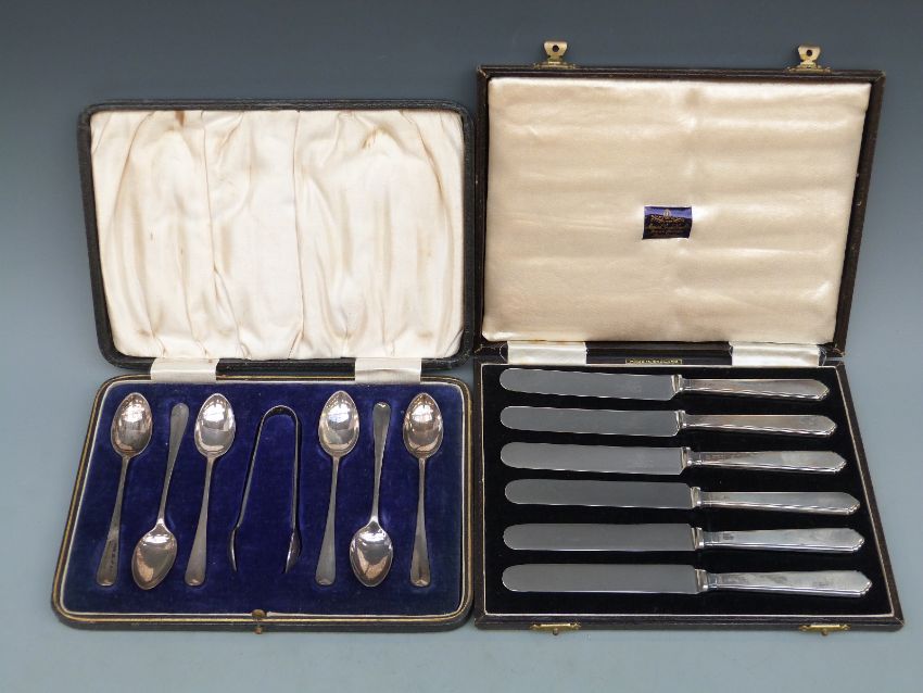 Cased set of hallmarked silver rat tail teaspoons and tongs, 104g and a cased set of hallmarked silver handled knives