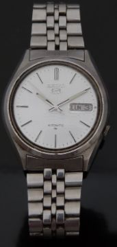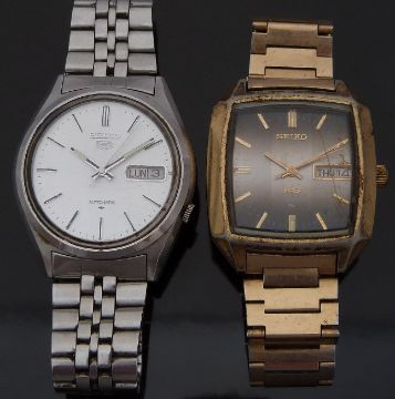 Two Seiko gentleman's automatic wristwatches comprising Seiko KS Hi-Beat gold plated wristwatch ref. 5246-5030 with day and date aperture, smoked and bevelled face and gold hands and baton numerals, on gold plated bracelet case diameter 34mm, serial number 330098 and Seiko 5 ref. 7009-8400A with day and date aperture, luminous hands, two-tone baton markers, silver face and stainless steel case, on stainless steel bracelet, case diameter 37mm, serial number 970179.