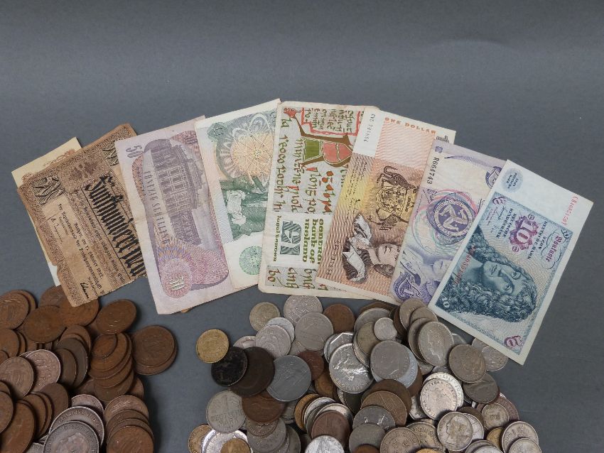 A quantity of pre Euro world coinage, includes small USA and Australia etc, and a nineteenth century example, together with coinage and bank notes including UK, Australia, Ireland, Isle of Man etc, some crisp