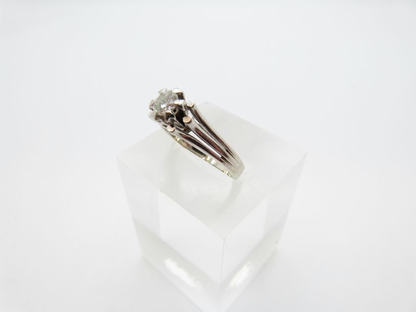 A white metal ring set with a round brilliant cut diamond of approximately 0.35ct in a raised setting, size N, 3.7g