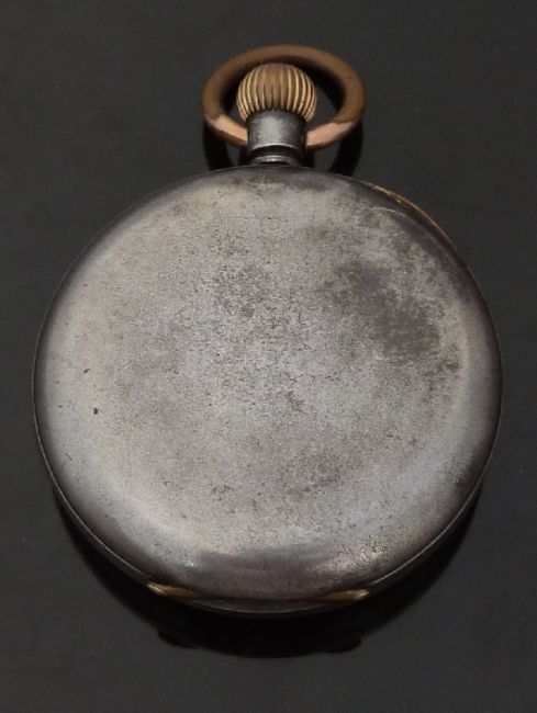 Omega gunmetal keyless winding open faced pocket watch with inset subsidiary seconds dial, gold hands, Arabic numerals, white enamel face and Swiss movement, case diameter 48mm, serial number 1855307.