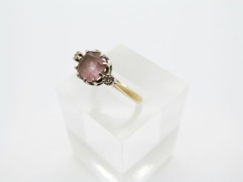 An 18ct gold ring set with a cushion cut pink sapphire and two diamonds, size M, 4.1g