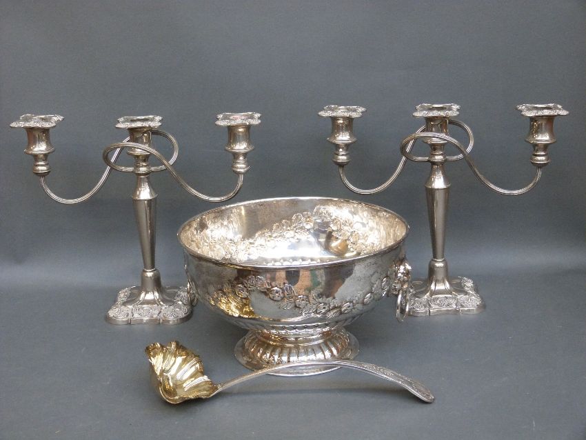 A silver plated punch bowl diameter 27cm with ladle, and a pair of silver plated candelabra sticks