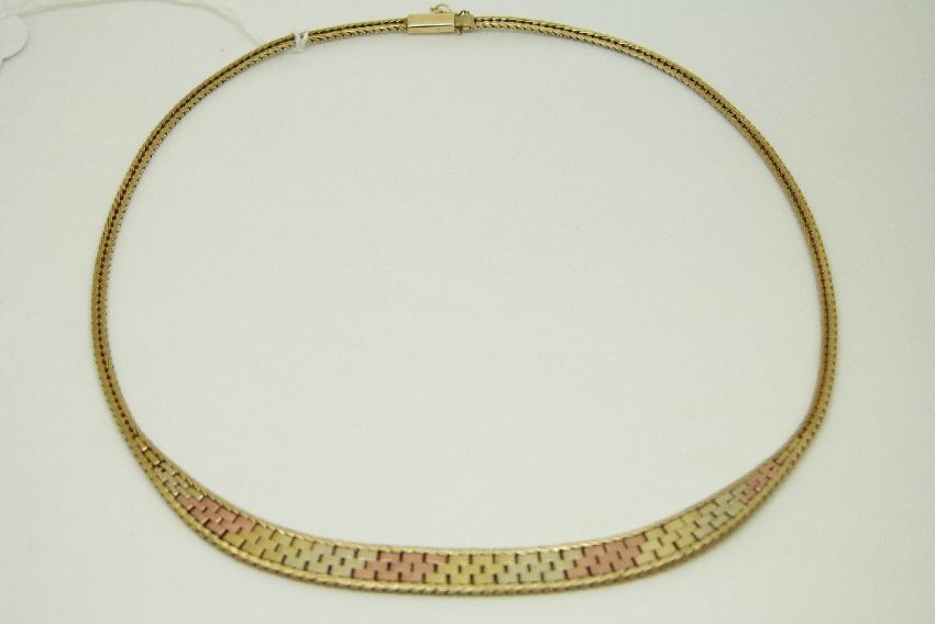 A 9ct gold tri-coloured necklace, 16.9g