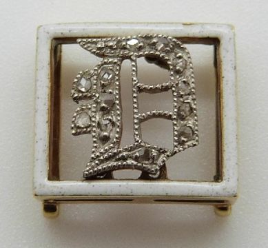 Victorian buckle set with white enamel border and an inset diamond D, in Asprey box