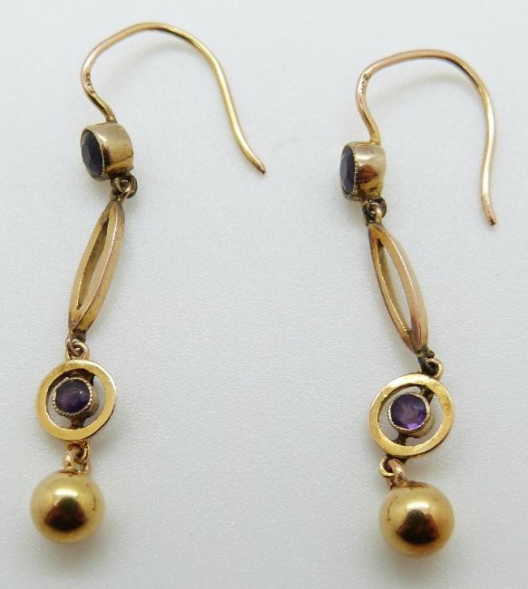 A pair of Edwardian 9ct gold earrings each set with two amethysts