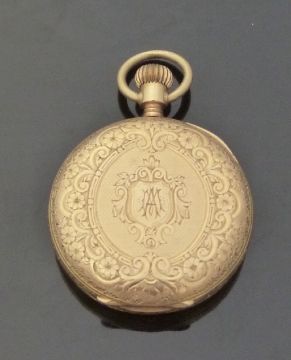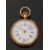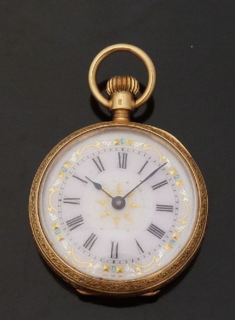 American Watch Company 18ct gold keyless winding open faced pocket watch with black hands, Roman numerals, gilt decorated white and pink enamel face, engraved case and signed safety barrel movement, case diameter 34mm, 36.5g, serial number 19820/ 5473638.