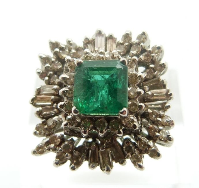 An 18ct white gold ring set with a square cut emerald of approximately 1ct surrounded by baguette and round cut diamonds, size L, 10.52g