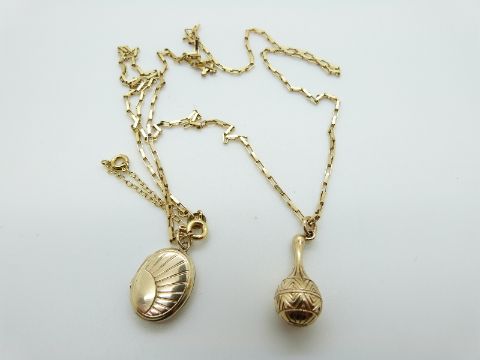 A 9ct gold necklace made up of rectangular links, a 9ct gold maraca pendant and a locket, 9.6g