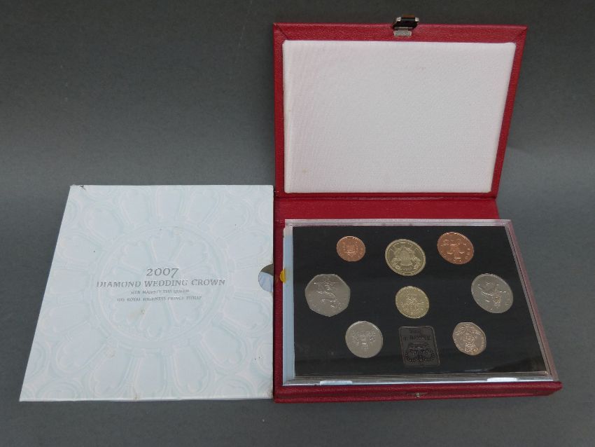 A 1986 deluxe cased Royal Mint coin collection and a 2007 souvenir commemorative Diamond Wedding crown