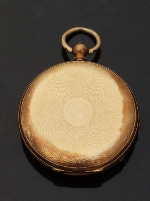 18ct gold open faced pocket watch with black hands, Roman numerals, engraved self coloured face, engraved case and unsigned movement, case diameter 37mm, 35.5g, serial number 11930.