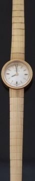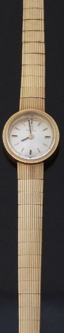 Omega 9ct gold ladies wristwatch ref. 5115002 with two-tone hands and baton markers, silver face and signed 17 jewel calibre 620 movement, on expanding metal bracelet, case diameter 19mm, serial number 317741.