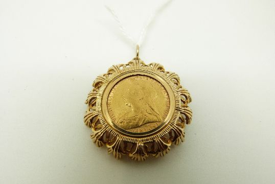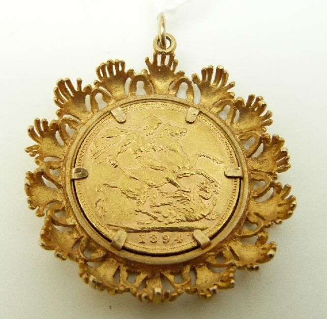 An 1894 gold full sovereign set into a 9ct gold pendant mount, 14.1g
