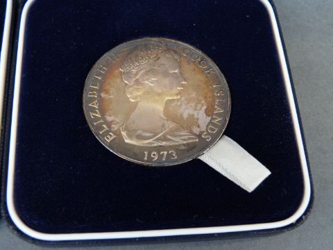 Two Cook Islands cased 1973 two dollar coins together with a Philippines Republic 1975 50 Piso and a 1974 10 dollar Barbados proof coin