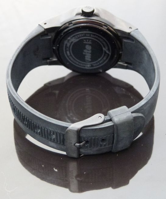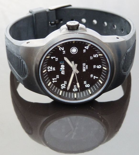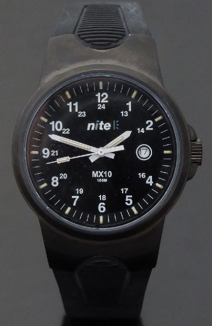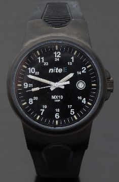 Nite MX10 gentleman's military style wristwatch with date aperture, luminous hands and markers, Arabic numerals, black stainless steel case and quartz movement, on black rubber strap, case diameter 39mm.