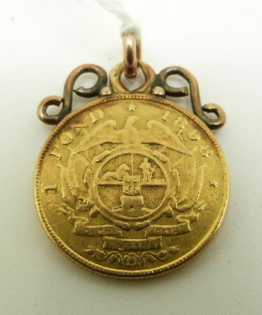 An 1898 South African 1 Pond gold coin with mount, 9.1g