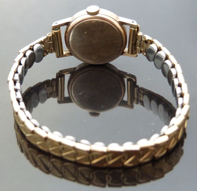 Omega 9ct gold ladies wristwatch with black hands, gold baton markers, silver face and signed 17 jewel calibre 580 movement, on integral 9ct gold bracelet, case diameter 15mm, 17.8g, serial number 7115708, in original box.