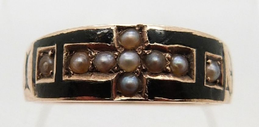A Victorian mourning ring set with black enamel and seed pearls reading 'In memory of' around the band, size M/N, 2.6g