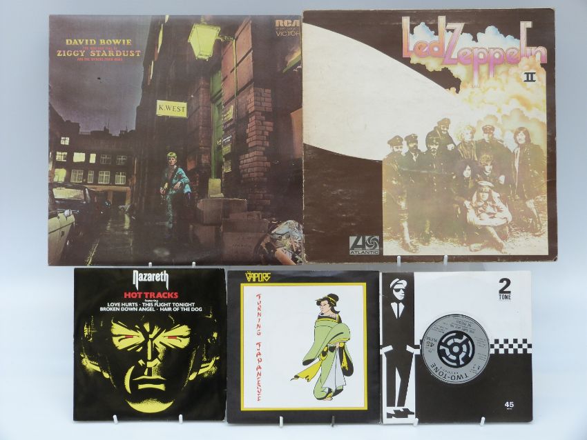 Twenty-seven LPs including David Bowie (3), The Beatles (4) Stranglers, Blonde and Led Zeppelin, plus a carry case of singles