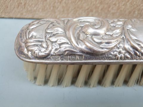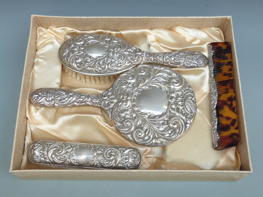 Cased modern hallmarked silver four piece embossed dressing table set including hand mirror