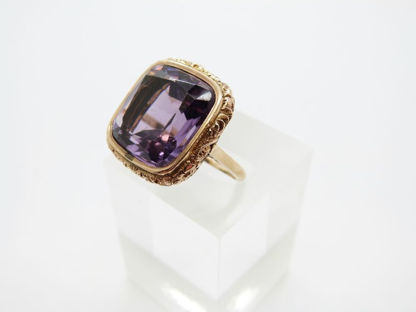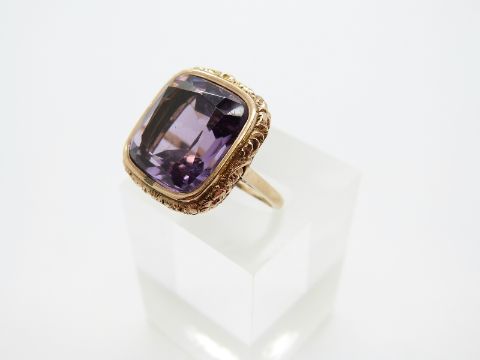 A 9ct gold ring set with a large cushion cut amethyst in an engraved foliate surround, size M, 8.1g