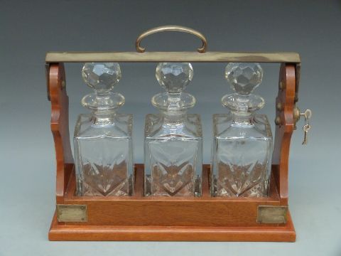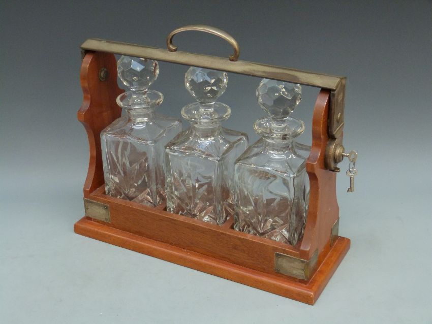 A three bottle mahogany tantalus with key, impressed PB and S, length 39cm, 34cm tall