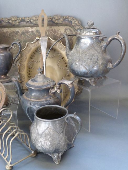 A large collection of silver plated ware including a heavy twin-handled tray, length 61cm, basket, tea set, Hinks no 2 oil lamp burner
