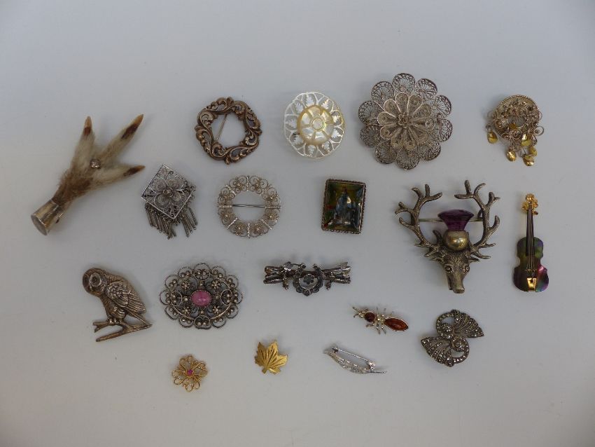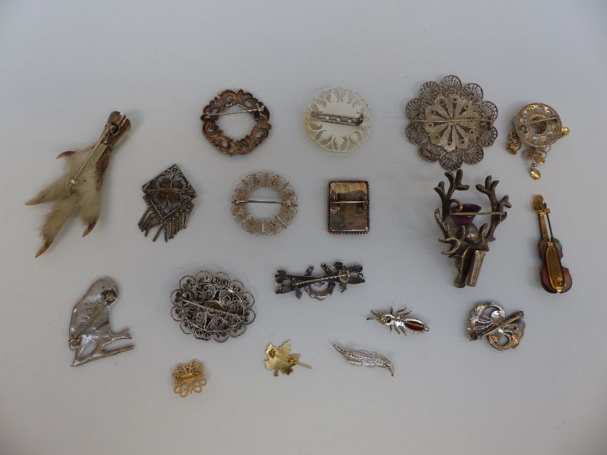 A collection of silver and white metal brooches including filigree, Victorian sweetheart brooch, mother of pearl, Stag and thistle brooch etc
