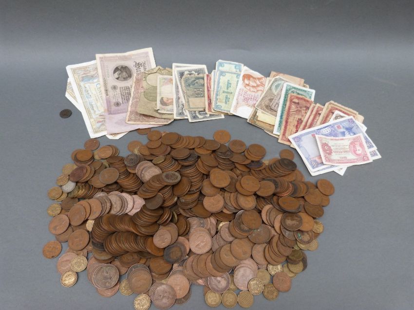 A collection of UK bronze, includes an 1813 John Knapp, Worcester farthing, together with thirty five world bank notes mostly mid nineteenth century includes a consecutive pair 'Farmers Bank of China' examples