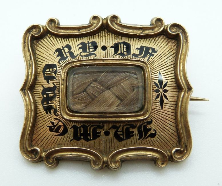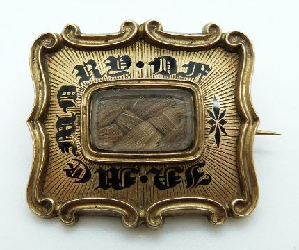 A Georgian brooch set with plaited hair surrounded by black enamel writing "In memory of" verso "Mary Stanley Obt August 21st 1825 at 53, Francis Dent Obt December 10th 1832 at 5"