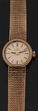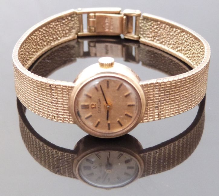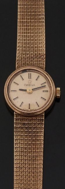 Omega 9ct gold ladies wristwatch ref. 1061 with black hands, two-tone baton markers, gold face and 17 jewel calibre 40 196454 movement, on integral textured 9ct gold bracelet, case diameter 17mm, 21.3g, serial number 7115670.