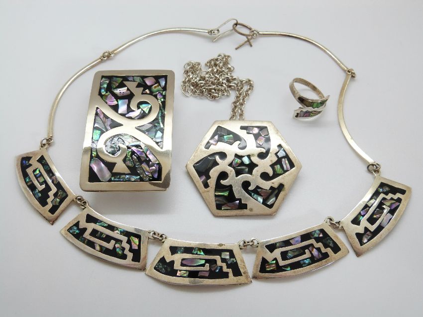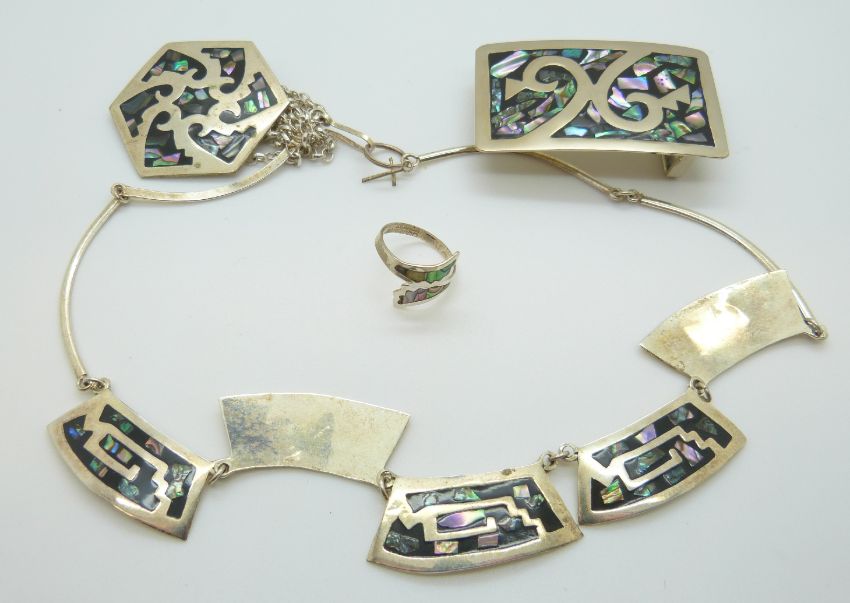 A necklace set with mosaic abalone, with matching ring, brooch/pendant and buckle all marked Alpaca Mexico