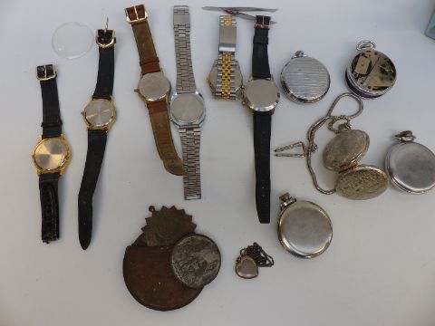 Eleven various pocket and wristwatches including Ingersoll, Lucerne etc together with a silver locket on chain, compass, cigarette case and a Charles and Diana scarf in original box.