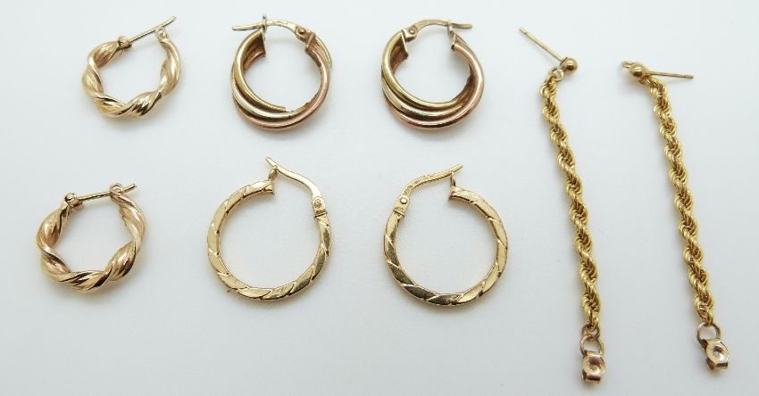 Three pairs of 9ct gold hoop earrings and a pair of 9ct gold rope twist earrings, 7g