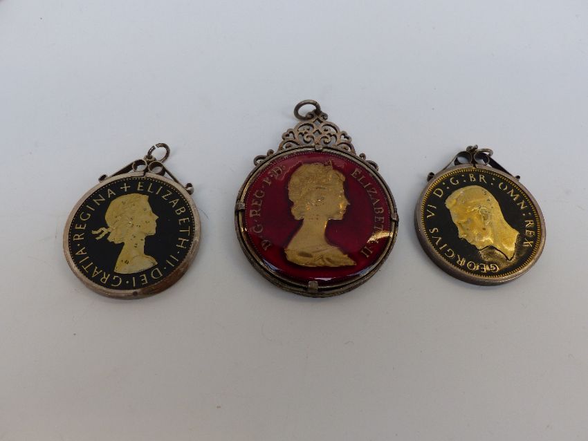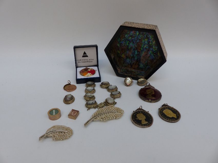A collection of jewellery including 9ct gold charms (6.2g), enamelled coins, mother of pearl cameo bracelet, millefiori pendant etc